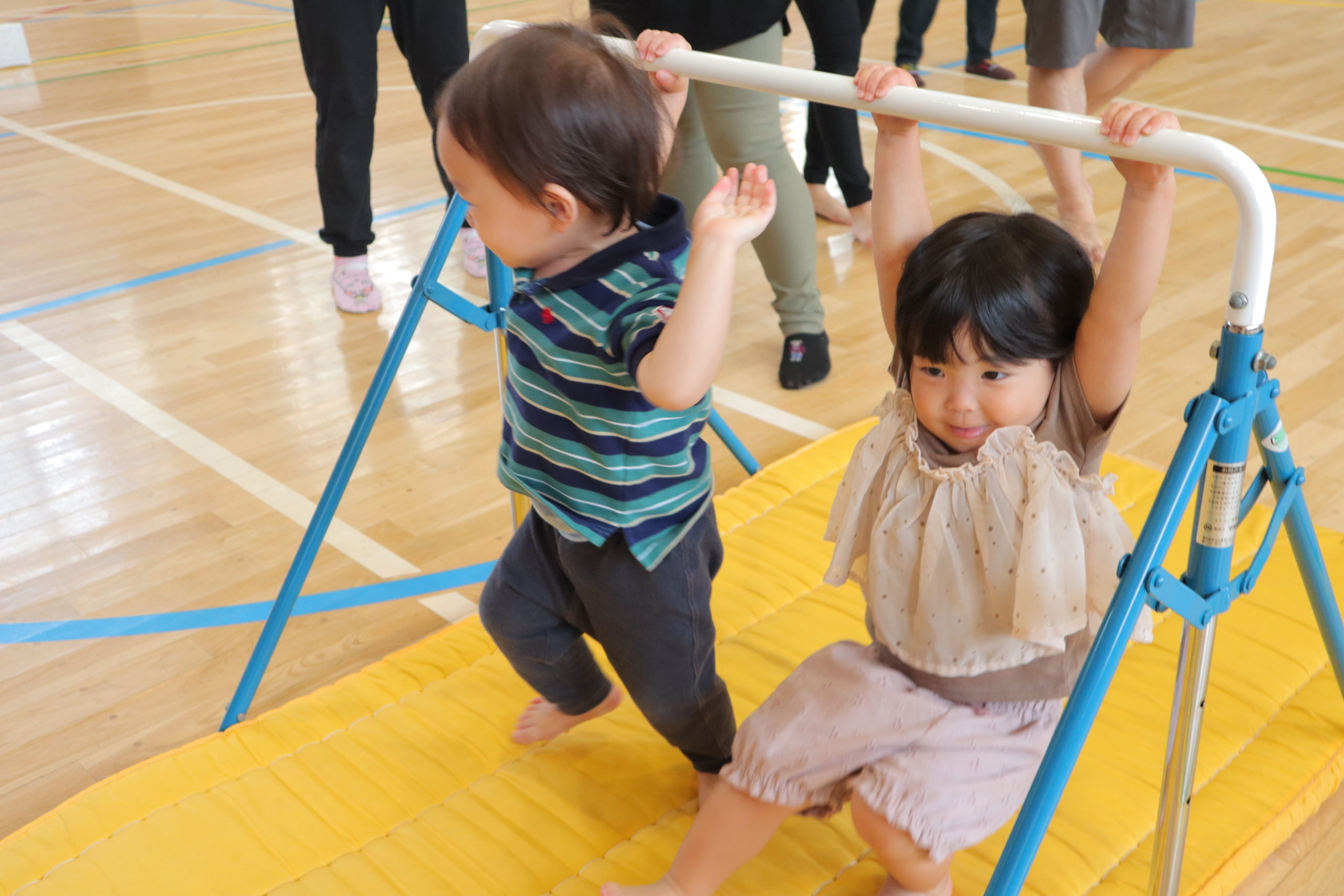 ▲毎週園で行なっている体操教室の鉄棒を使ったり、マットの上をハイハイしてトンネルを潜り抜けたり。
