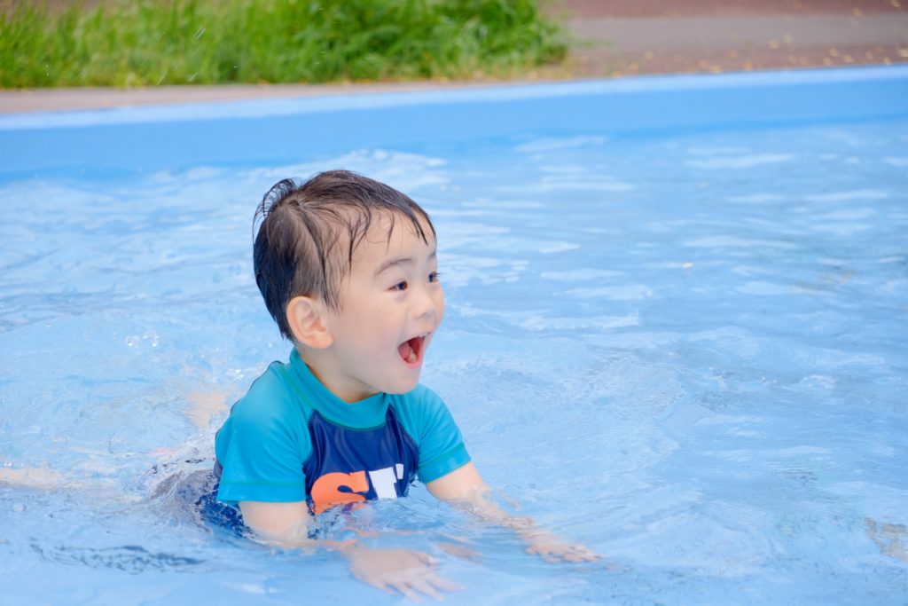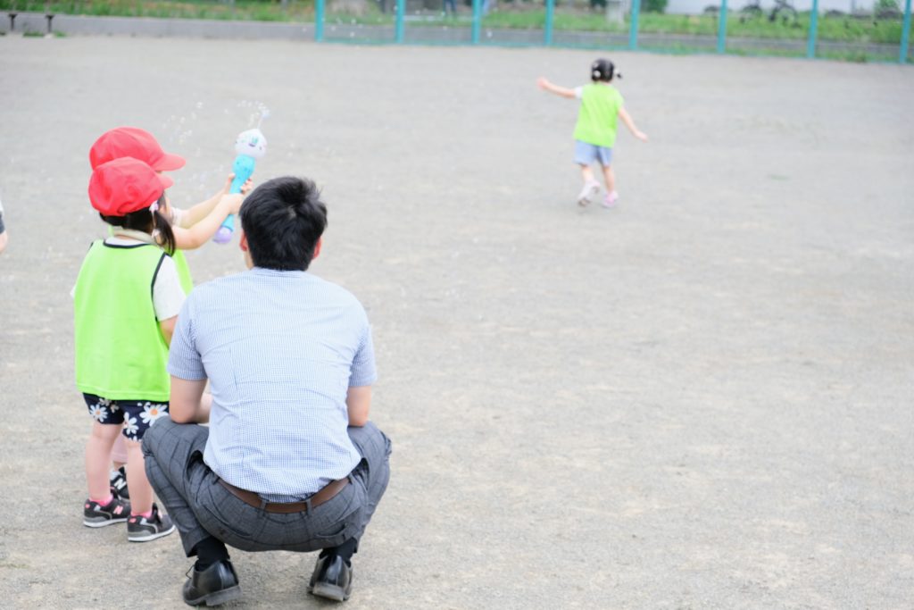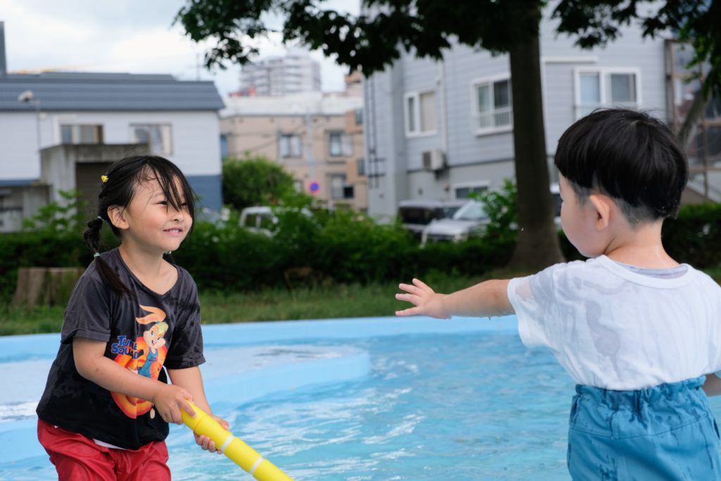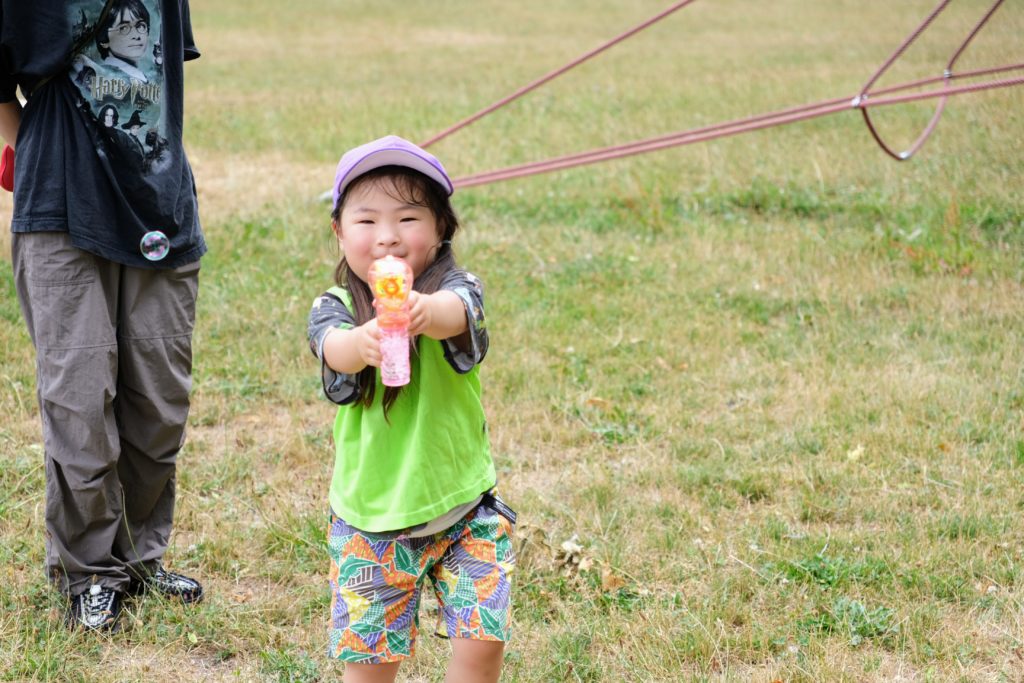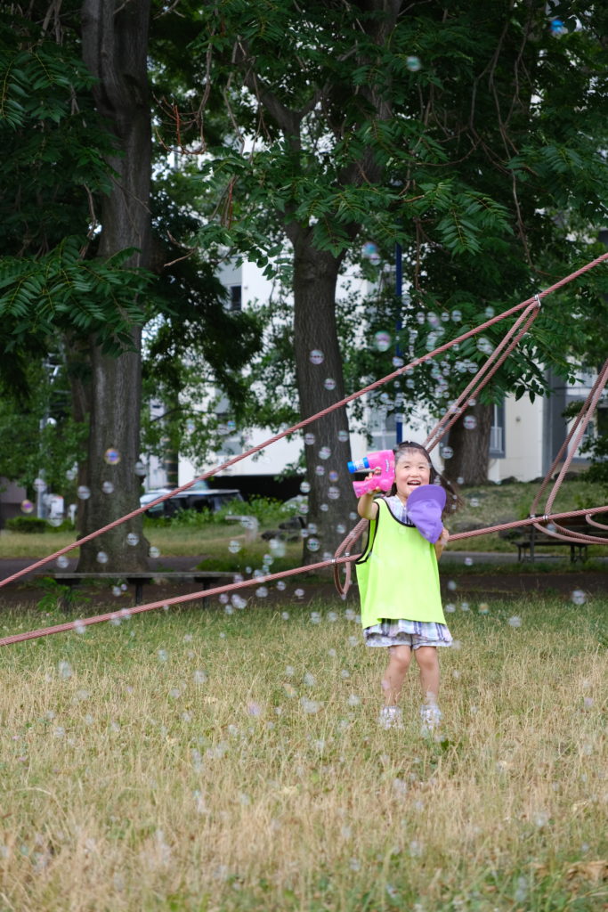 水遊びに限らず、シャボン玉で遊ぶ子、