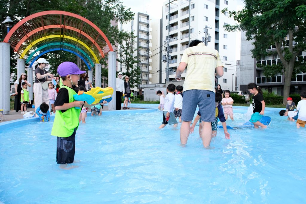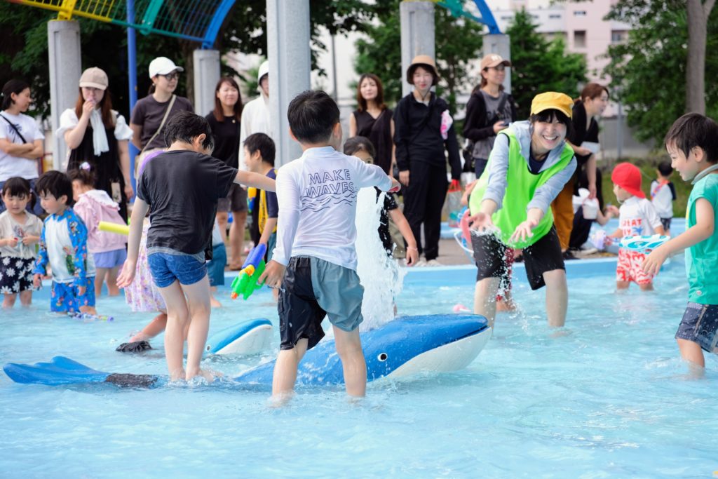 一緒に水に入り、濡れながら遊んでくださる保護者の方も。