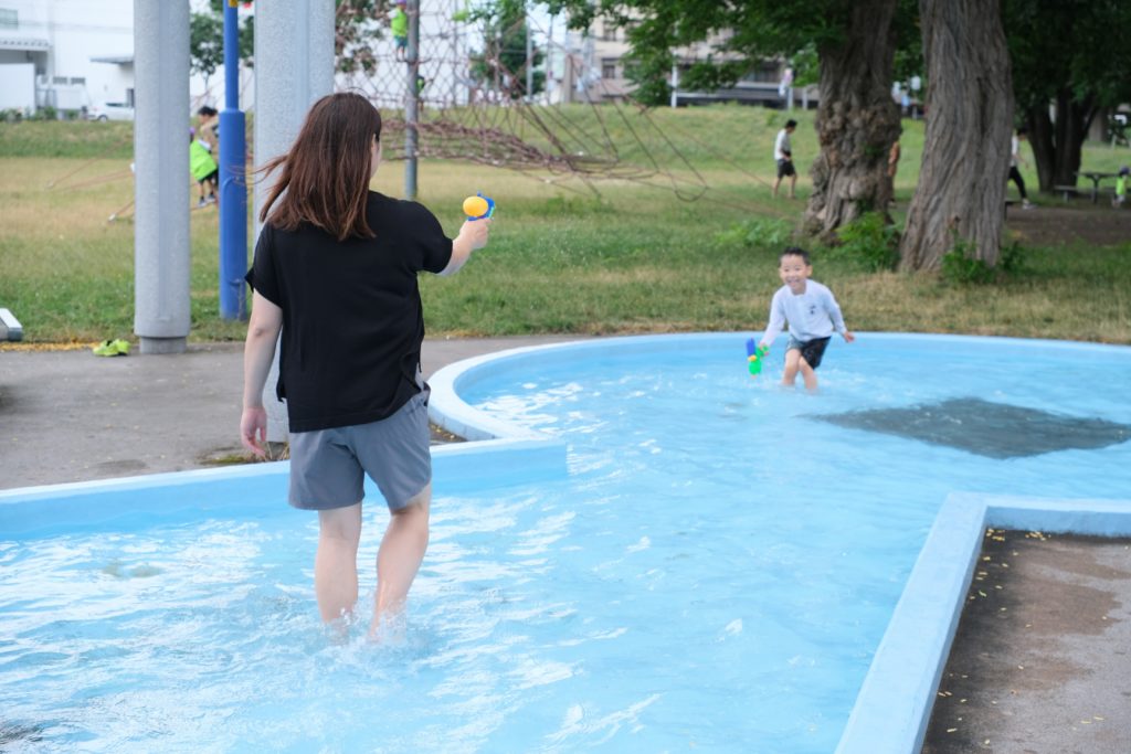 「お父さん、着替えないよ〜」といいながら水鉄砲を浴びるお父さん。