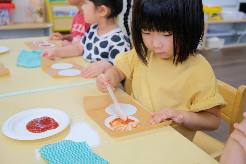 ケチャップを塗って、みんなが作ったチーズをのせて