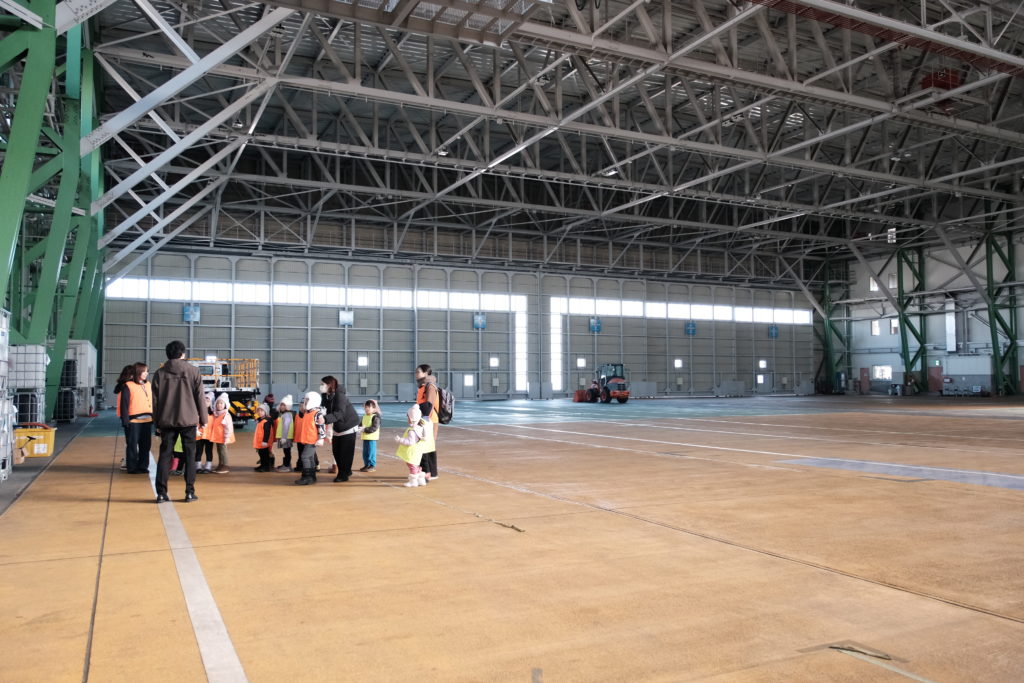 「みんなと同じように、飛行機もねんねするんだけど、ここがその場所だよ。元気がない時に手当てもするよ。今はすべての飛行機が元気だから、倉庫には飛行機がないんだけどね。」と優しく教えてくれました。