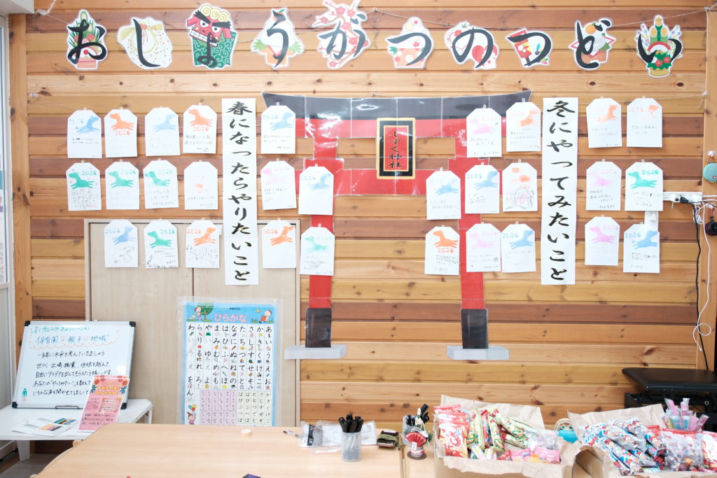 「おしょうがつのつどい」が終わる頃には、壁一面に、願いごとが書かれた絵馬が並んでいました。