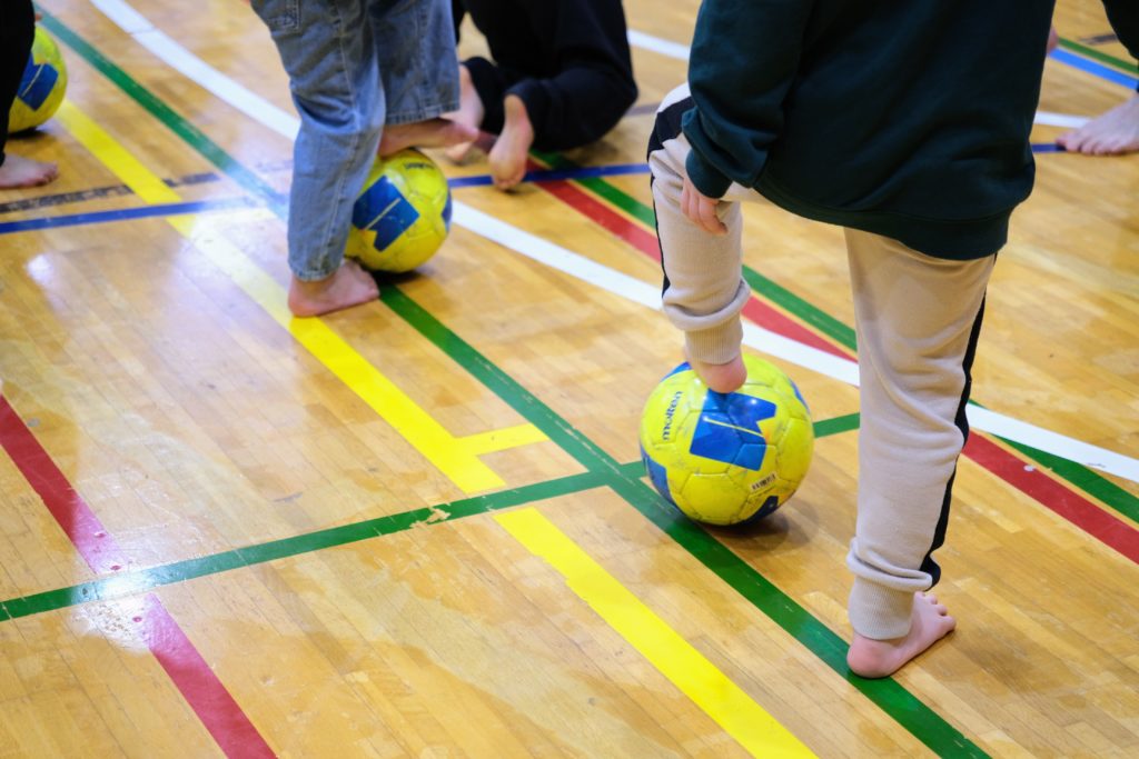 体育館のラインの上をボールを蹴りながら進んでみたり